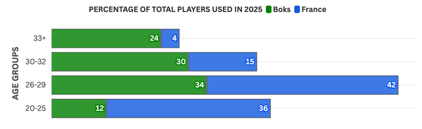 18th February 2026 SA v France depth comparison Comparing the Springboks and France's Test depth according to age profile and caps.